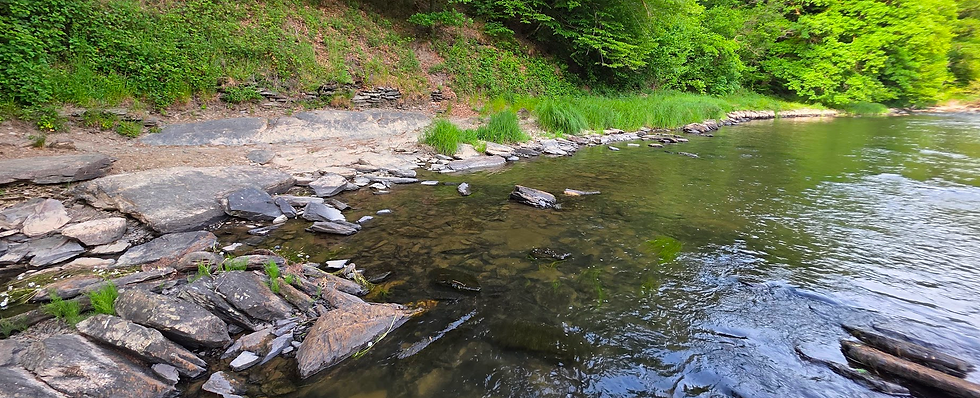 De plus, pour revenir sur le sujet de la vanne, les passes dites "rampes en enrochements", qui consistent à relier le bief aval et amont par un chenal dans lequel l'énergie est dissipée plus ou moins régulièrement répartie afin de créer une voie de passage avec une pente plutôt faible pour permettre aux poissons de continuer leur migration vers l'amont de la rivière, y ont été sculptées dans le schiste.